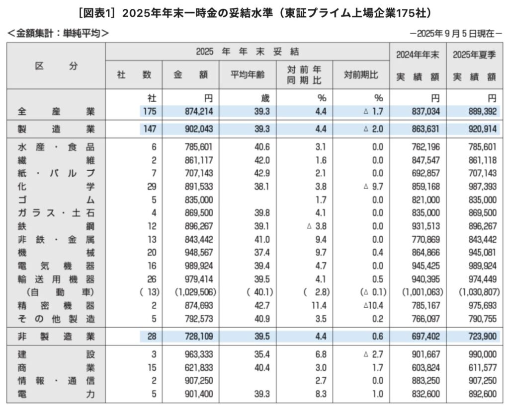 ただし、すべての企業でこの水準とは限りません。例えば、2025年に集計された大手上場企業 175 社の年末一時金の平均額は 約 87.4万円 との報告もあります